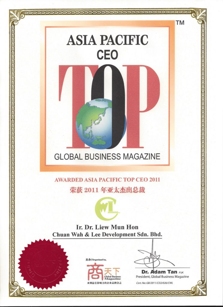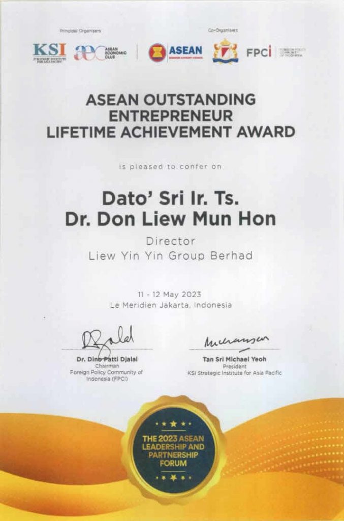 Apart from that, Dato’ Liew is also very active in participation of social activities and community welfare services. He currently holds as President of the Lung Kong Federation Malaysia, Perak Contractor’s Association, and holding Senior Position in many more NGOs. He also hold as past Deputy President of Perak Chinese Assembly Hall, the Directorship of the S.M.J.K Ave Maria Convent, Perak Community Specialist Hospital (formerly known as Perak Chinese Maternity Hospital).