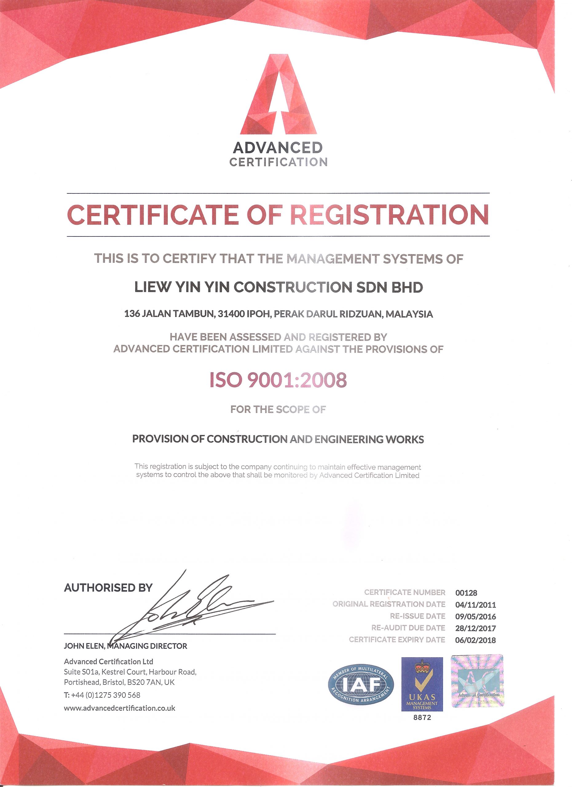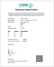 Currently, our Construction Arm, Liew Yin Yin Construction Sdn. Bhd. is registered as G7 Contractor (projects with no limits) with the CIDB, and also an ISO 9001:2008 certified company. The contracts executed by the Company include Conventional and Turnkey projects, which consists of design and built system.